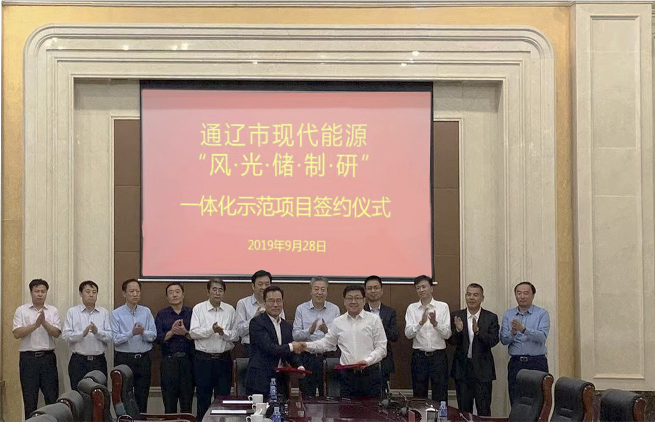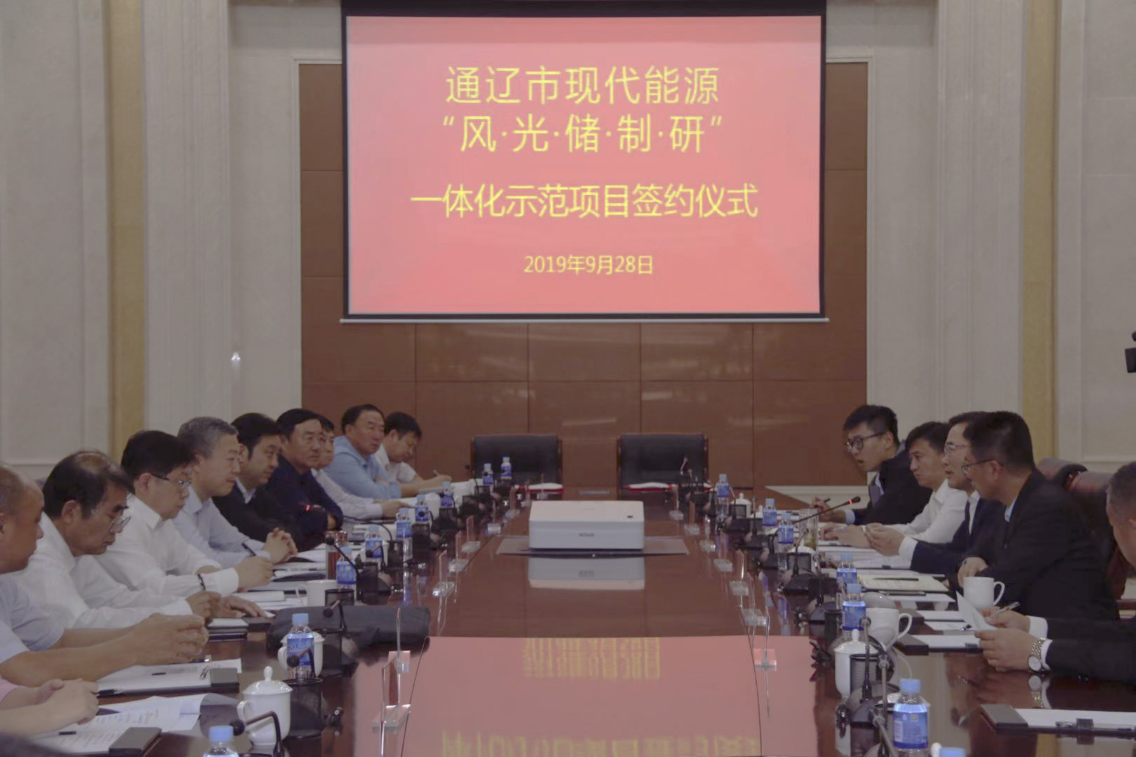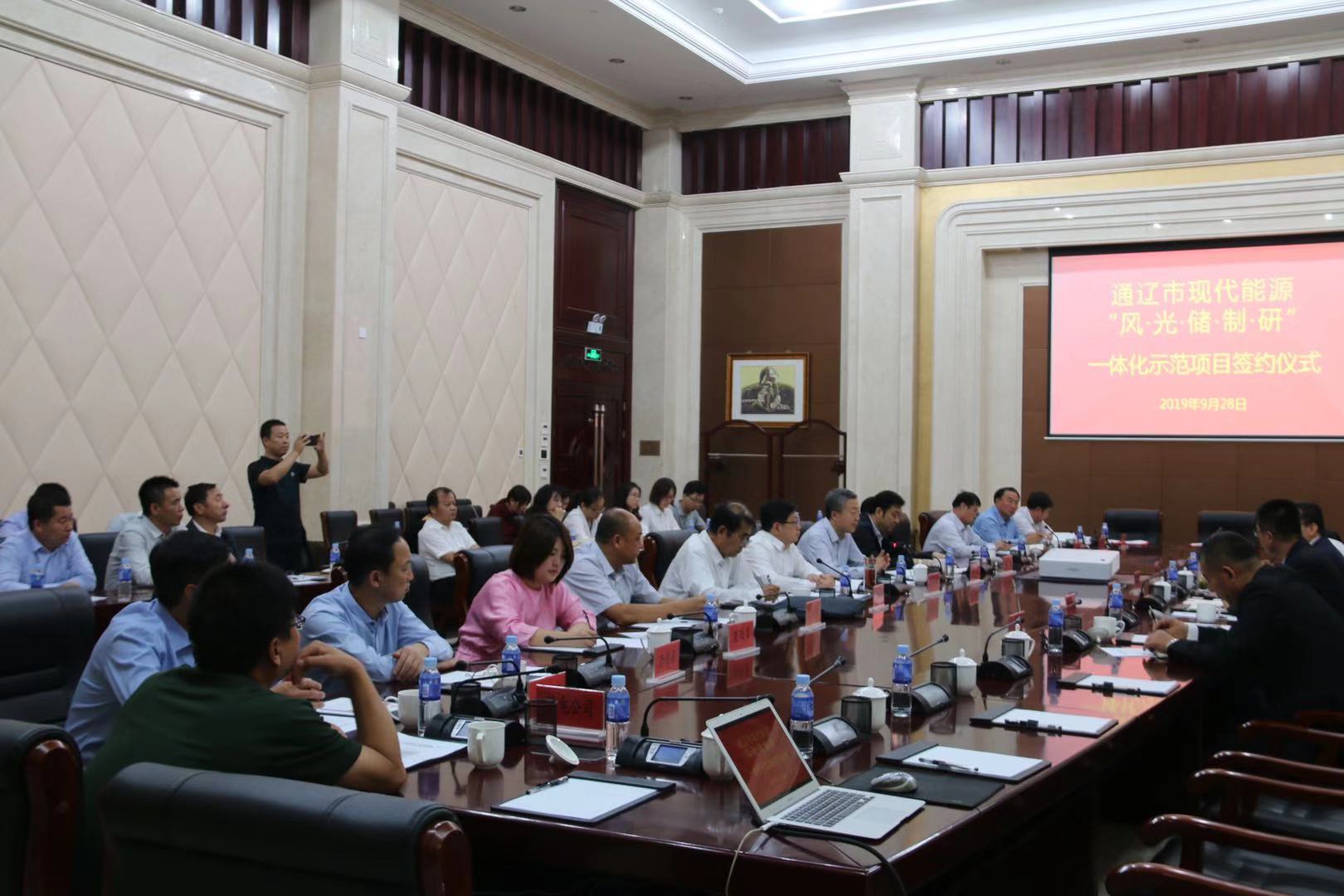 2019年9月28日,通遼市現代能源“風光儲制研”一體化示范項目座談簽約儀式舉行。明陽集團董事長張傳衛,明陽集團副總裁兼內蒙古公司總經理王利民,內蒙古恒瑞新能源有限公司董事長劉歆參加儀式,由通遼市市委常委、副市長張銳主持儀式,通遼市市領導王瓊、張海峰以及市直有關部門和旗縣政府負責人也參加了此次儀式。