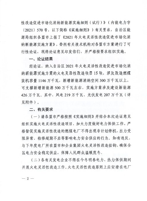 內蒙古恒瑞新能源受內蒙古錦聯電廠和霍煤鴻駿電力分公司委托,編制了《內蒙古錦聯鋁材有限公司火電靈活性改造促進市場化消納新能源試點項目實施方案》和《內蒙古霍煤鴻駿電力分公司火電靈活性改造促進市場化消納新能源試點項目實施方案》,本次兩個方案均被列入自治區2021年火電靈活性改造項目名單。方案涉及改造燃煤裝機容量136萬千瓦,建設新能源87萬千瓦,其中風電45萬千瓦、光伏42萬千瓦。