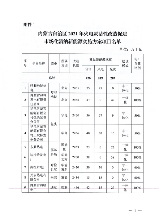 截至2021年8月,各盟市共計上報近40個火電靈活性改造項目方案,經自治區能源局組織委托有關技術機構對上報方案進行可行性論證后,最終納入內蒙古2021年火電靈活性改造的項目計15項,涉及改造燃煤裝機容量1146萬千瓦,新增新能源消納空間300萬千瓦以上,可支撐新增新能源500萬千瓦左右,實施方案涉及建設新能源426萬千瓦。其中,風電219萬千瓦、光伏207萬千瓦。