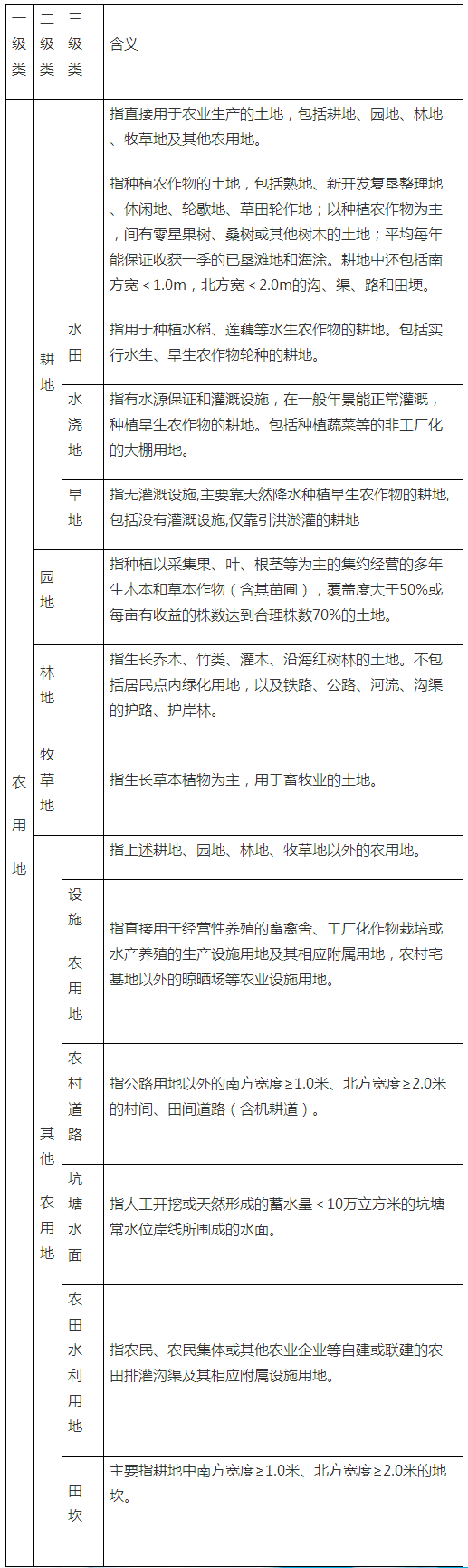 按照《土地管理法》和國土資源部頒布的《土地分類》的規定,農用地是指用于農業生產的土地,包括耕地、園地、林地、牧草地及其他農用地。農用地分為下列五種:耕地;園地;林地;牧草地;其他農用地。