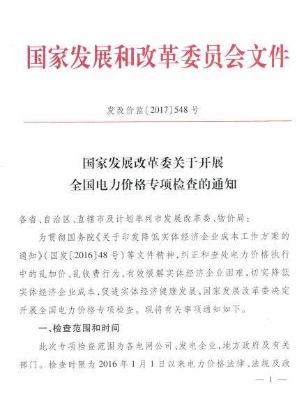 3月21日,國家發展改革委印發《關于全國電力價格專項檢查的通知》(發改價監〔2017〕548號),提出開展全國電價大檢查。